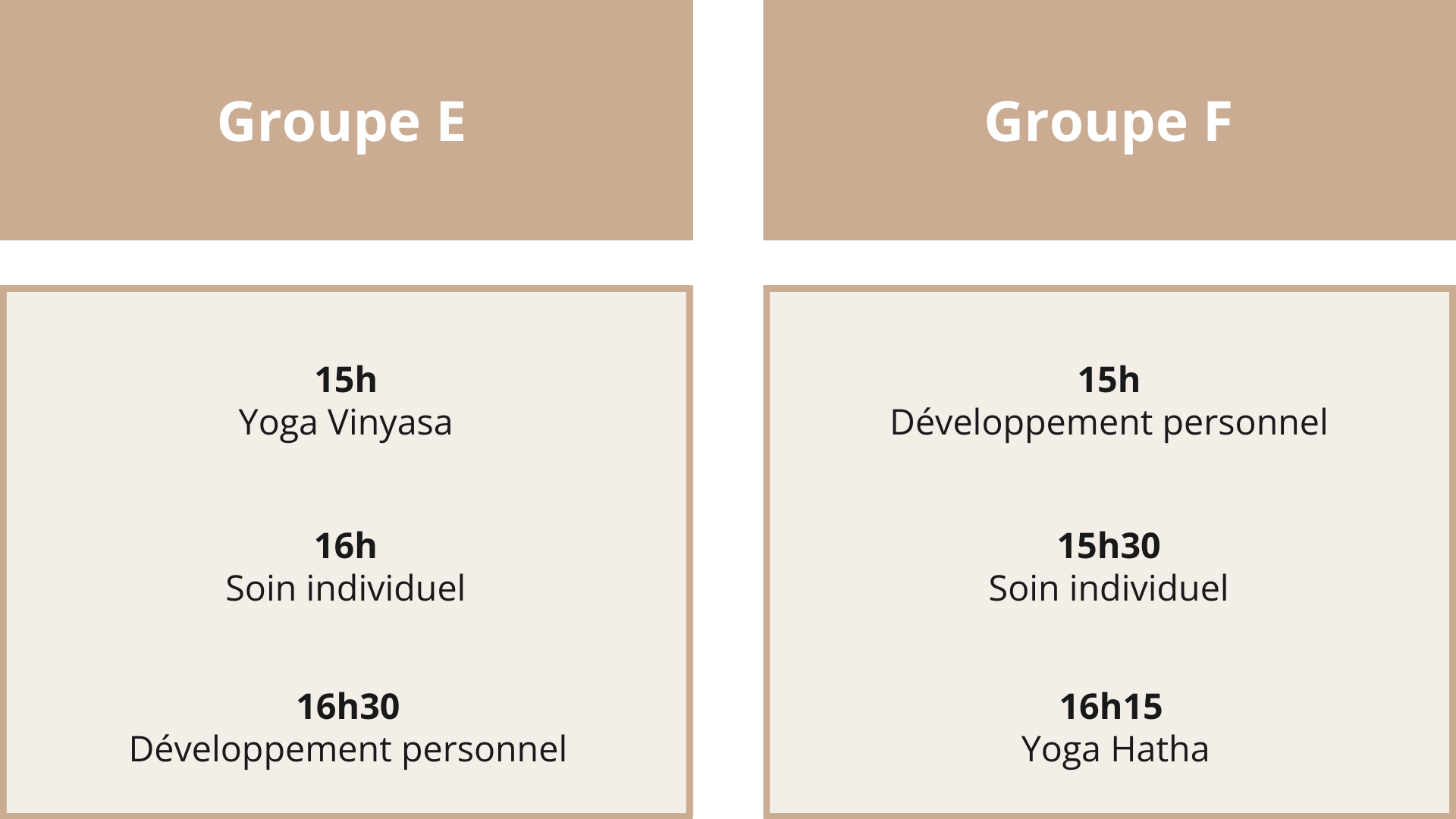 Sélectionnez le souffle souhaité : 1 (matin), 2 (midi) ou 3 (après-midi). Après votre sélection, au moment de la réservation, indiquez le groupe que vous souhaitez intégrer et le soin individuel que vous aimeriez avoir. Une confirmation, avec toutes les informations, vous parviendra sous 48 à 72 heures.